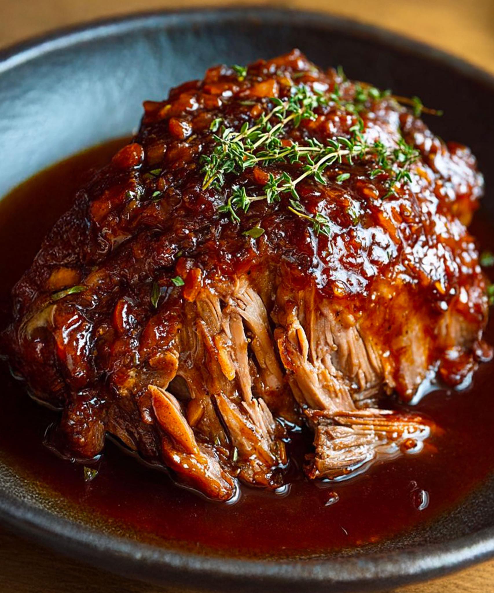 Táto verzia sa spolieha na neodolateľné spojenie: tmavé pivo s hlbokými praženými tónmi sa stretáva so zlatou sladkosťou javorového sirupu. Spoločne vytvárajú zamatovú, jemne karamelizovanú omáčku, ktorá mäso obaľuje bohatou a lahodnou intenzitou. Výsledkom je konfitovaná bravčová plec, taká krehká, že sa rozpadá pri najmenšom dotyku vidličky.