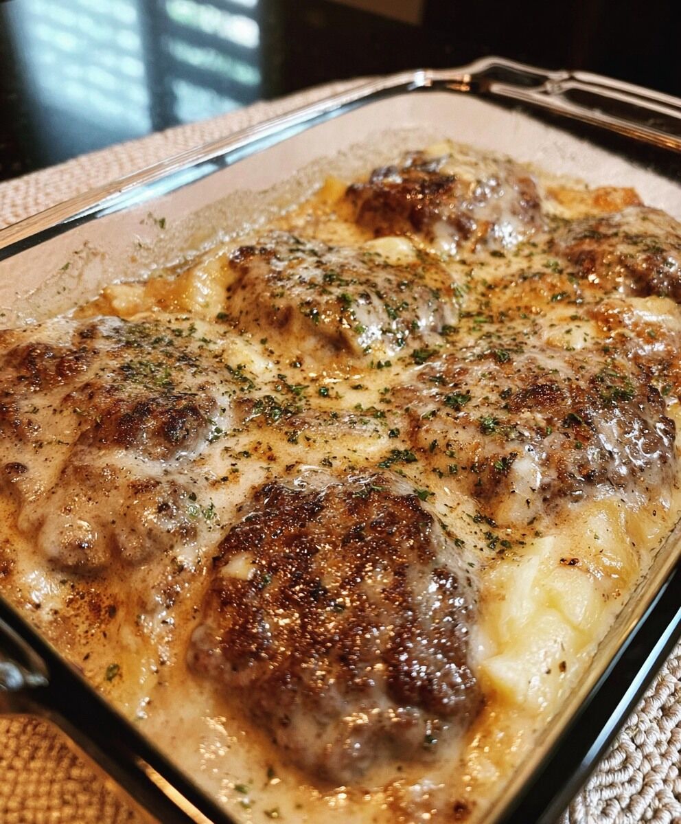 Tento Amish Burger Steak Gratin je výdatné a chutné jedlo, ktoré je ideálne na večeru počas týždňa. Šťavnaté burgerové burgery sú poliate krémovou hubovou omáčkou, vďaka čomu je to lahodné a sýte jedlo.