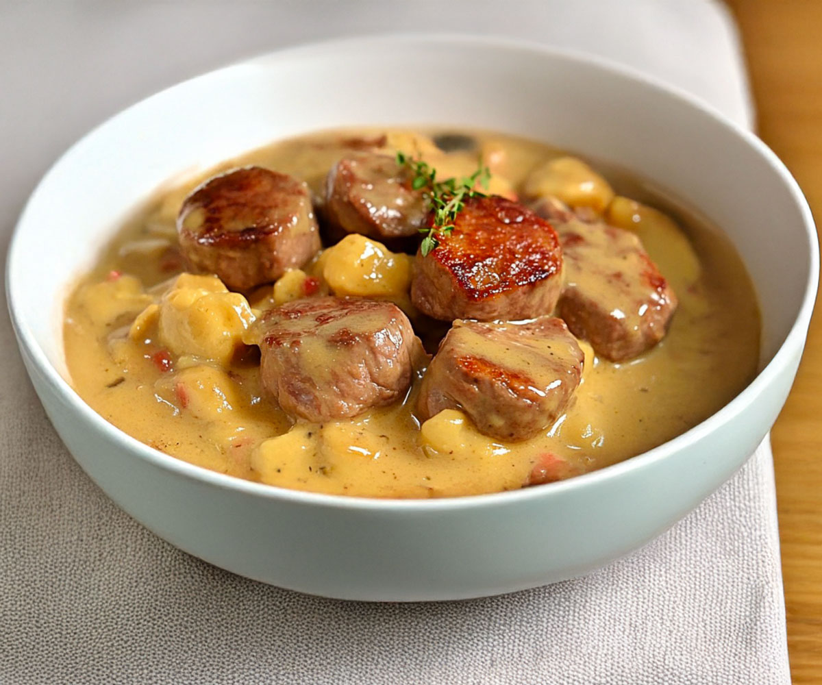 Keď teploty klesnú a objaví sa chuť na chutné jedlo, nič sa nevyrovná chutnému receptu, ktorý sa vám rozplýva na jazyku a zahreje pri srdci aj chuťové poháriky. Bravčová panenka s roztaveným syrom Reblochon dokonale stelesňuje túto chuť: jemné mäso obaľované v krémovej syrovej omáčke, to všetko umocnené jemnými arómami cibule a teľacieho vývaru.