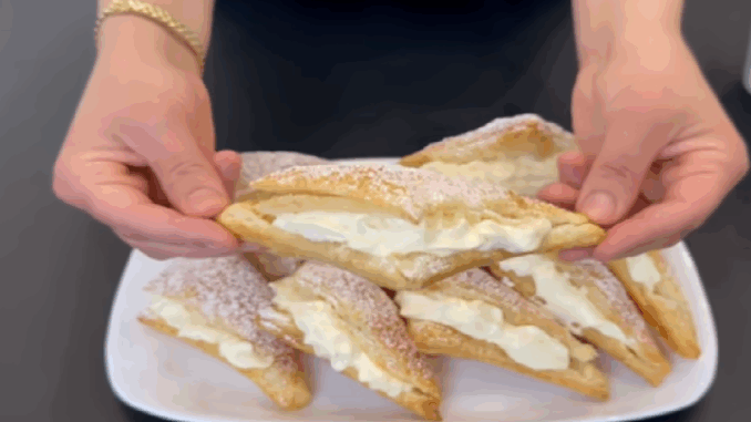 Lístkové cesto preložíme a nakrájame na 6 rovnakých častí. Každý kúsok zložíme do tvaru trojuholníka. Potrieme olejom alebo maslom. Trojuholníky potrieme vodou a posypeme cukrom.