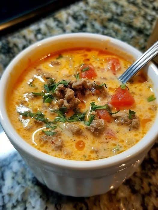 Polievka kombinuje ochutené mleté hovädzie mäso, cesnak, cibuľu, paradajky, jemné čili papričky a bohatý syrový základ.