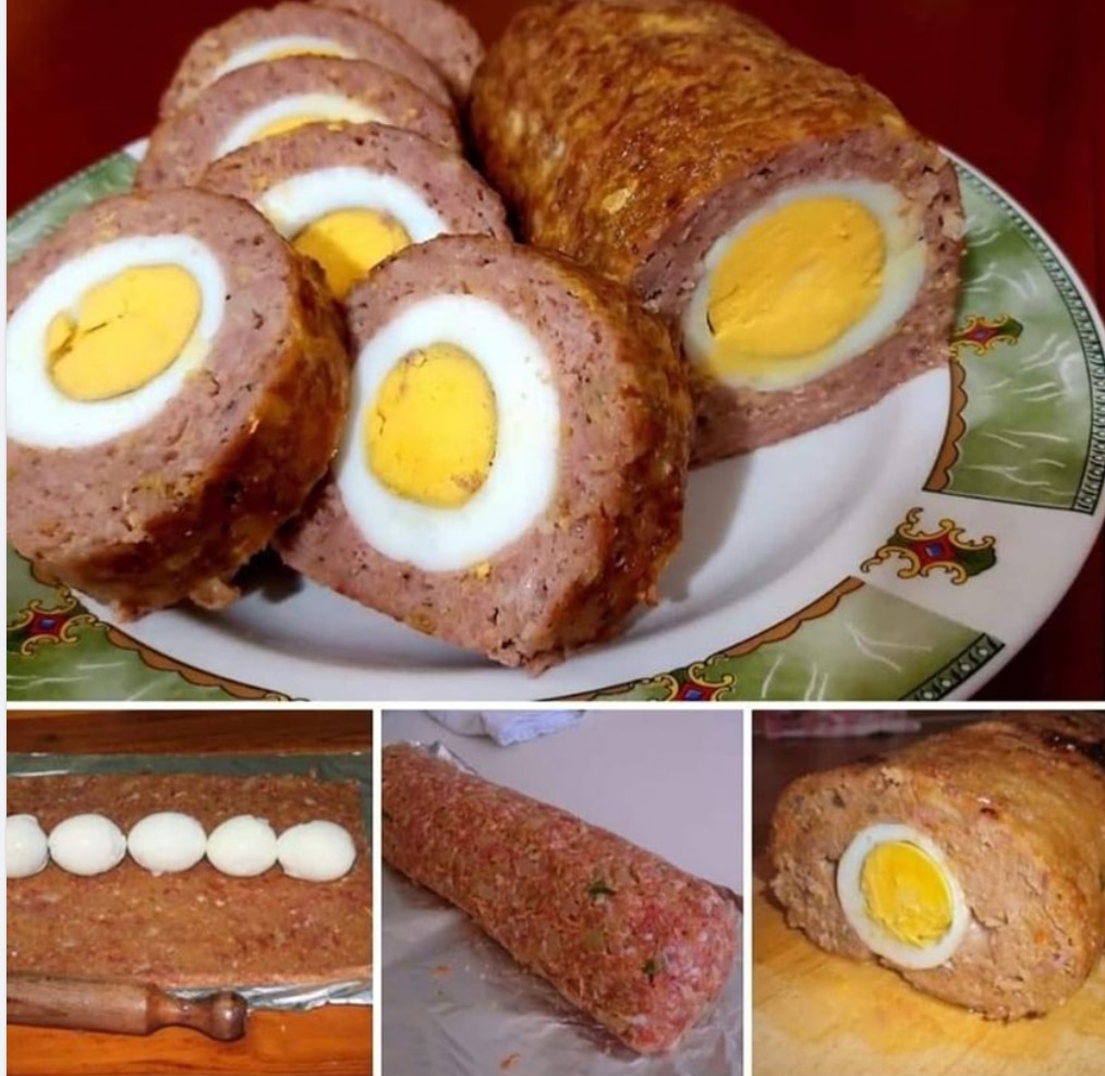 Hmotu rozložíme na naolejovaný alobal. Do stredu poukladajte vajcia uvarené na tvrdo a roládu jemne zrolujte. Osušíme zo všetkých strán, aby sa okraje dobre prilepili, potrieme olejom a dáme piecť do vyhriatej rúry na 180°C pečieme asi 30 minút.