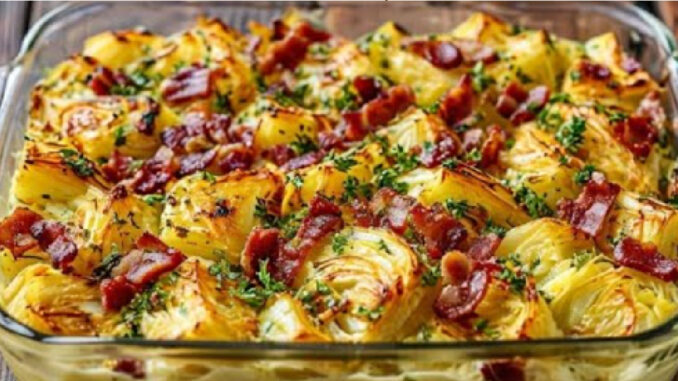 Tento zapečený pokrm zo zemiakov, slaniny a kapusty je výdatný a plný chuti – ideálny na rodinný obed alebo večeru. Kombinácia jemnej kaše, chrumkavej strúhanky a roztekajúceho sa syra poteší každého milovníka domácej kuchyne.