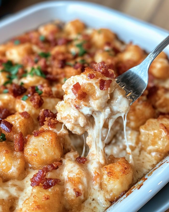 Kuracie, slaninové a rančové tater tot kastról je lahodná fúzia chutí a textúr, ktorá stelesňuje étos pohodového jedla Stredozápadu. Toto jedlo kombinuje krémovú bohatosť rančového dresingu, pikantnú chuť slaniny a chrumkavú textúru tater tot, to všetko spojené veľkou vrstvou syra. Je to dokonalý príklad toho, ako sa jednoduché ingrediencie môžu spojiť a vytvoriť niečo skutočne uspokojujúce. Toto kastról je ideálne na rodinné stretnutia alebo spoločné večierky, kde ho jeho výdatnosť a lahodná chuť určite urobia obľúbeným.