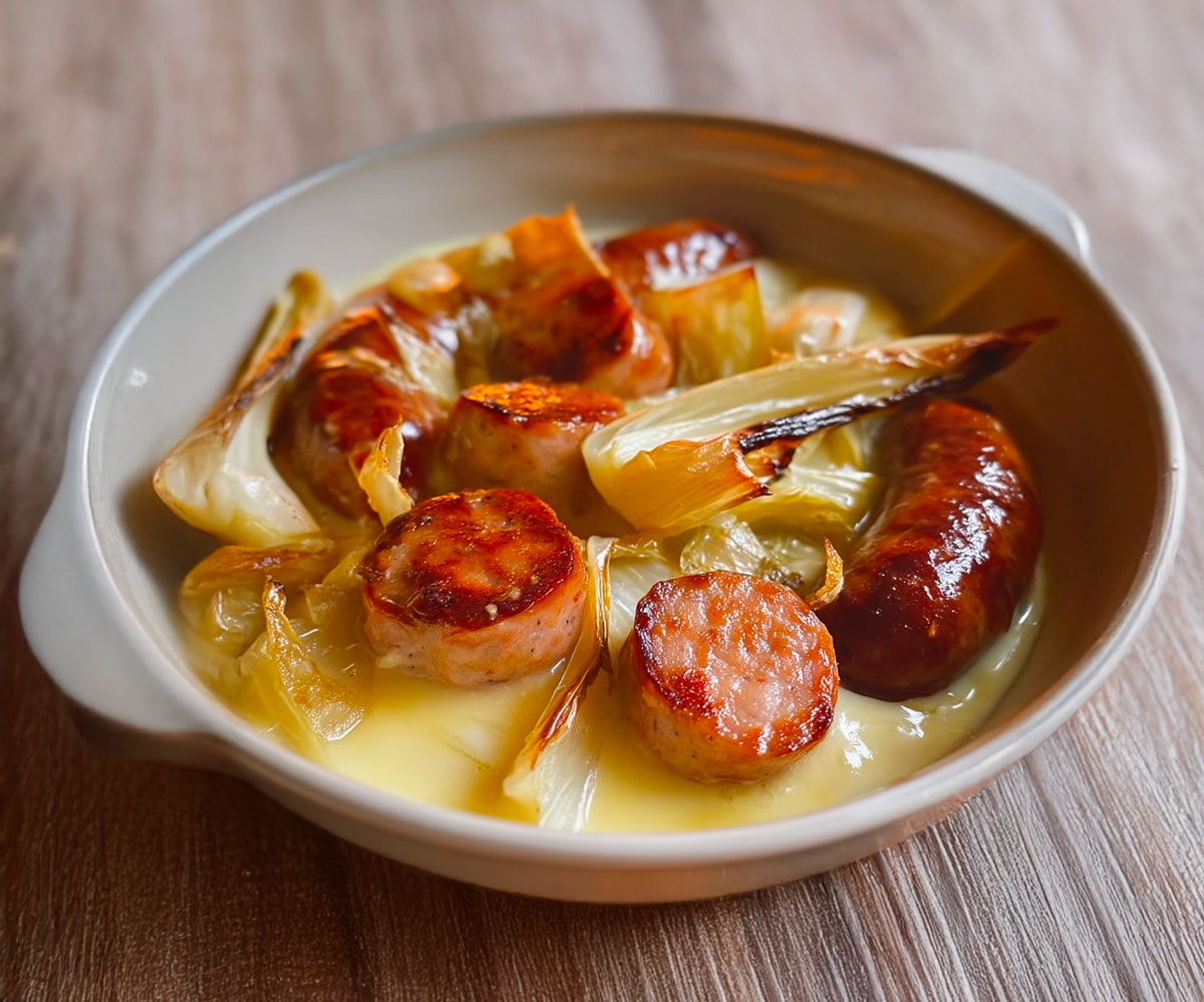 Pór, často odsunutý do úzadia, tu zastáva čestné miesto. Jemne sa rozplýva, absorbuje chute smotany a klobásovej šťavy a vytvára hladkú, mierne sladkú omáčku, ktorá dokonale vyvažuje bohatosť mäsa. Je to dokonalá harmónia medzi rastlinnou sladkosťou a údenou intenzitou.