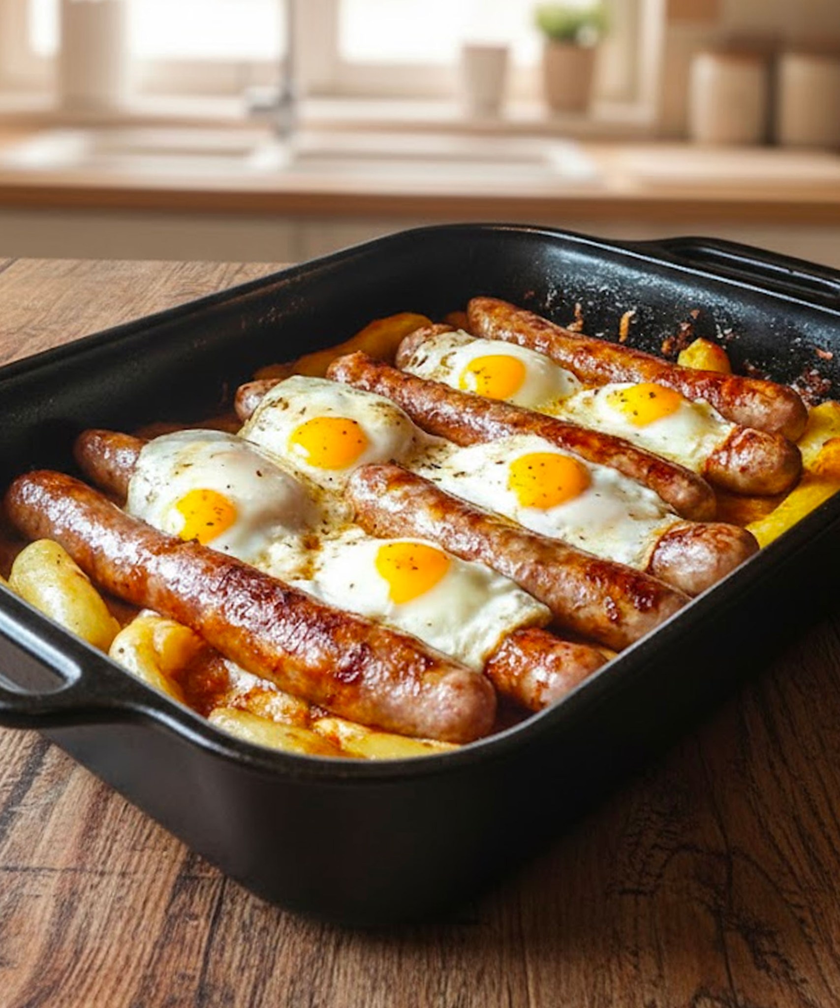 Pečené zemiaky sa vo vnútri rozplývajú a okraje sú mierne chrumkavé, zatiaľ čo klobásy uvoľňujú svoju arómu, keď sa pomaly pečú v rúre. Celé jedlo je zakončené dokonale uvarenými vajíčkami, ktorých žĺtky sú stále tekuté, čo mu dodáva krémovú konzistenciu a neodolateľný nádych pôžitku.