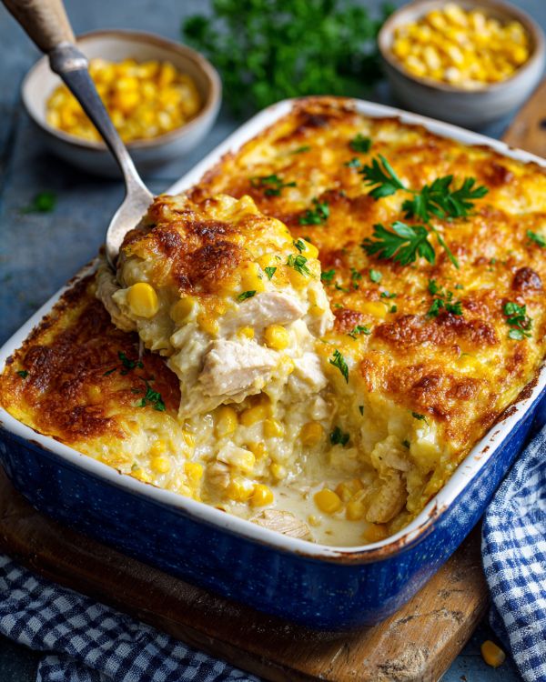 Tento krémový zapekaný kukuričný a kurací pokrm pečený v rúre je chutné jedlo, ktoré je ideálne na rodinné večere alebo spoločné posedenia. Tento recept, ktorého korene siahajú do kuchyne Stredozápadu, krásne spája sladkosť kukurice s pikantnou chuťou kuracieho mäsa, to všetko spojené v krémovej omáčke. Je to jedlo, ktoré zahreje na duši a prinesie spomienky na výdatné domáce jedlá. Či už chcete zapôsobiť na hostí útulným zapekaným pokrmom alebo si jednoducho chcete vychutnať lahodné jedlo so svojimi blízkymi, tento zapekaný pokrm je vynikajúcou voľbou.