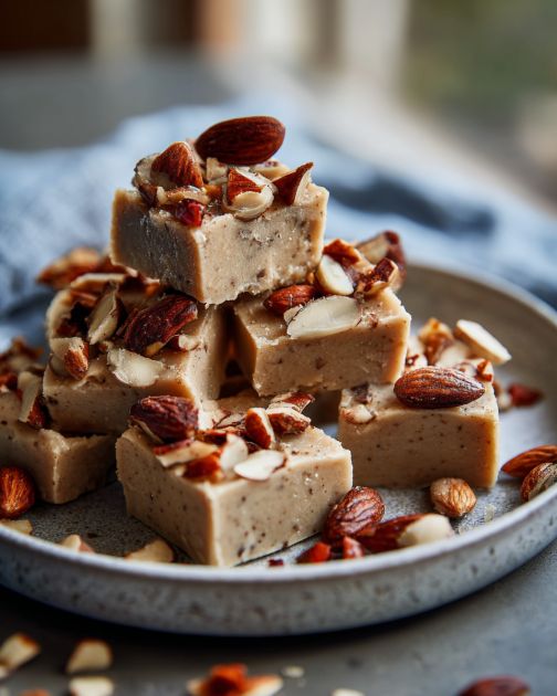 Tento mandľový maslový fudge je krásny v malých štvorčekoch pri šálke horúcej kávy alebo nesladeného čaju, najmä po jednoduchej večeri z pečeného kurčaťa a zeleniny. Pekne sa hodí aj na dezertný podnos s čerstvým ovocím – maliny a jahody tvoria pekný nízkosacharidový kontrast k hustému, orieškovému fudge. Na sviatky alebo rodinné stretnutia rád naaranžujem fudge na vinobranie tanier s možno párkrát praženými orechmi roztrúsenými okolo, s malou miskou šľahačkou pre tých, ktorí chcú extra nádych bohatstva. Je to sladké sústo, ktoré nekričí o pozornosť, ale nenápadne dopĺňa jedlo tak, ako to vždy robí dobrý stredozápadný dezert.