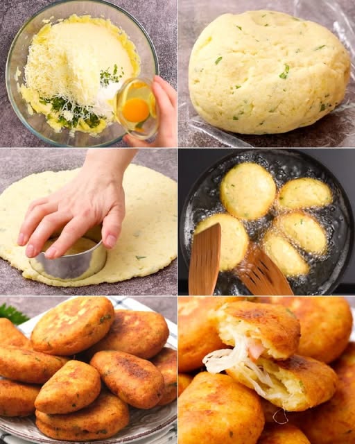 Cesto rozvaľkajte na hrúbku asi 1 cm. Vykrojte kruhy pohárom alebo vykrajovačom na perníčky. Do stredu každého kruhu dajte trochu syra a šunky, potom prikryte ďalším kruhom a okraje opatrne zalepte, aby ste vytvorili zemiaky (môžete ich tiež vyrobiť ručne ako knedle).